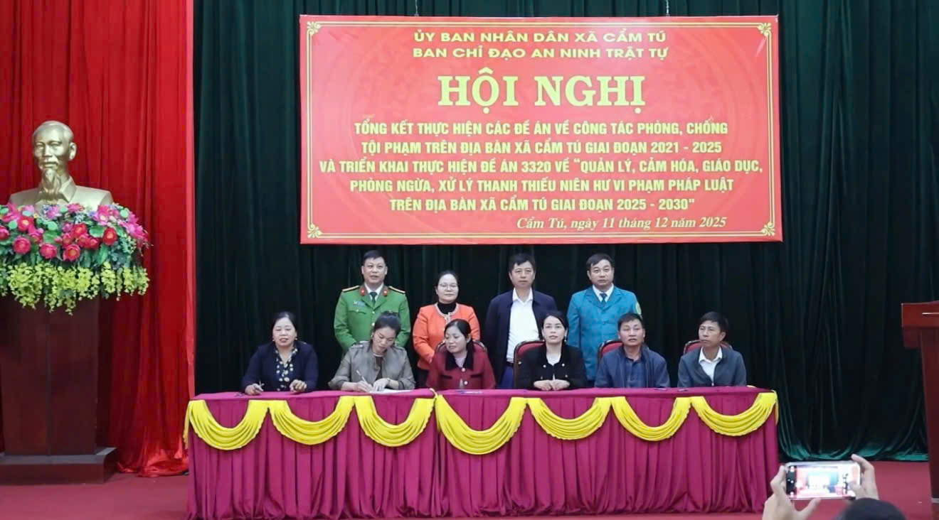 Sáng ngày 10/12/2025, Ban chỉ đạo ANTT xã Cẩm Tú tổ chức hội nghị tổng kết thực hiện các Đề án về công tác phòng, chống tội phạm trên địa bàn xã Cẩm Tú giai đoạn 2021 - 2025 và triển khai thực hiện Đề án 3320 về “Quản lý, cảm hoá, giáo dục, phòng ngừa, xử lý thanh thiếu niên hư vi phạm pháp luật trên địa bàn xã Cẩm Tú giai đoạn 2025 - 2030”. Dự hội nghị có đồng chí Nguyễn Thị Hồng Hạnh – UVBTV, Phó Chủ tịch UBND xã; lãnh đạo Công an xã; cùng đại diện các ban, ngành, đoàn thể, các thôn và các trường học trên địa bàn.